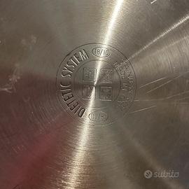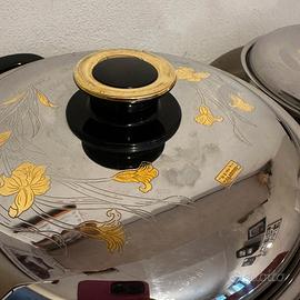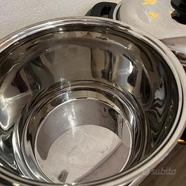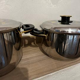 Set di pentole in acciaio inox con coperchio, dal design elegante con dettagli dorati. Le pentole sono robuste e capienti, perfette per l’uso quotidiano: ideali per pasta, zuppe, sughi e preparazioni di ogni tipo. Dotate di manici ergonomici resistenti al calore e coperchi con pomello comodo per una presa sicura. Il fondo garantisce una buona distribuzione del calore per una cottura uniforme. Condizioni buone, normali segni di utilizzo ma perfettamente funzionanti Prima a sinistra: 27 cm larghezza e 19cm altezza Seconda a destra: 30 cm larghezza e 16cm altezza