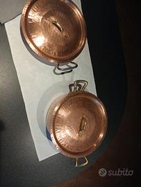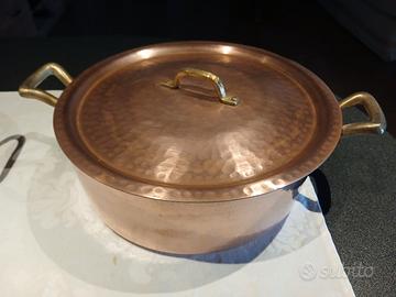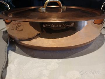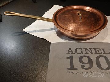 Vendo 3 splendidi tegami professionali in rame liscio della storica fabbrica "Baldassare Agnelli", sinonimo di eccellenza nella cucina italiana. completi del loro coperchio originale con elegante impugnatura in ottone. Marca: Baldassare Agnelli (marchio inciso a vista). Materiale: Rame di alto spessore per una diffusione uniforme del calore. Interno: Stagnato a mano Dettagli: Maniglie in ottone massiccio fissate con rivetti. Condizioni: Ottime, come da foto. Ideale sia per cucinare ricette d'alta cucina che come oggetto d'arredo per cucine rustiche o di design. Diametro 30 Alt 7 VENDO IN BLOCCO NO SEPARATAMENTE Visibile a Monterosi Vt € 360