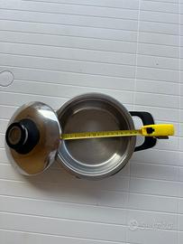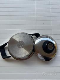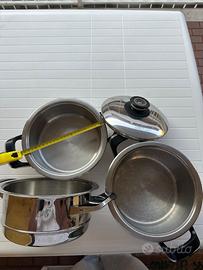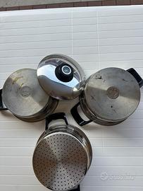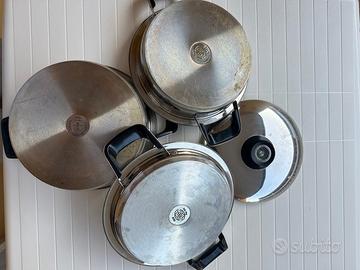 Batteria di pentole AMC varie dimensioni come da foto Condizione OTTIMA: un paio di pentole sono state usate 4/5 volte, le altre non sono state mai utilizzate. Il set è composto da n.7 pezzi in tutto n.3 da 28 cm. n.3 da 24 cm. e n.1 da 19 cm. Conservazione ottima. Pentole per fornello a gas no induzione