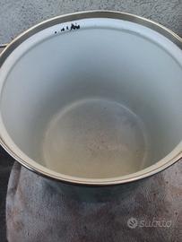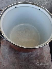 Pentole e coperchi smaltati vintage Siltal anni '70, caratterizzata da un design con geroglifici egizi e manici cromati.