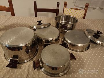 Vendo una pentola alta diametro cm. 28, con parte superiore sempre in acciaio, tipo scolapasta per lessare le verdure con relativo coperchio, due casseruole diametro cm. 28, un' altro coperchio diametro cm. 28 e una casseruola diametro cm. 24 senza coperchio.