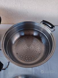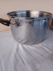 pentole in acciaio inox usate poco in ottimo stato il set è composto da una pentola alta 18cm con un diametro di 26cm + pentola bassa diametro 26cm + coperchio 26cm di diametro adatto a tutte due le pentole+ uno scolapasta sempre in acciaio inox il tutto in ottimo stato come da foto