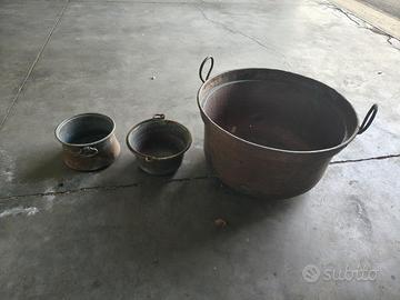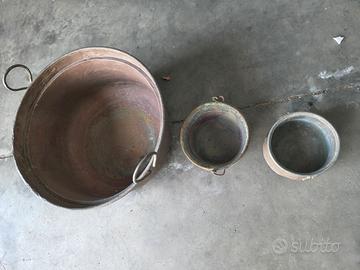 Tre pentole in rame in mio possesso da circa 45 anni al tempo acquistate usate diametro la grande 70 cm le due piccole 30 cm sono sane tranne una piccola che all interno ha 4 fori forse usata per un vaso. Vendo