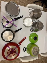 Tutto a 5 euro tranne pentola a pressione (50€), batteria per scolare la pasta (25€) e pentola alta verde (15€)