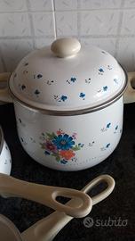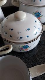 N* 6 pentole vintage smaltate decoro "Provincial Bouquet ", 4 con coperchio, prodotte da JMP - Newcore Ag Spagna nel 1989. Nuove mai usate. 1 pentola cm 21 diam. x 17 h + coperchio 1 pentola cm 21 diam. x 13 h + coperchio 1 tegame cm 21 diam. x 10 h + coperchio 1 tegame cm 19 diam. x 9 h + coperchio 1 pentolino cm 15 diam. × 7 h 1 pentolino cm 12 × 10 h.