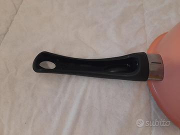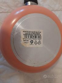 Il pentolino è nuovo, mai utilizzato e in vendita per mancato utilizzo; è in condizioni impeccabili, senza segni di usura o ammaccature, completo di etichetta originale del produttore. La casseruola è realizzata in alluminio con un elegante rivestimento esterno color pesca/corallo e un interno antiaderente con effetto pietra scuro, liscio e resistente. Prodotto interamente in Italia (Lotto 2024), garantisce qualità e sicurezza alimentare. Il pentolino può essere usato su piani cottura a gas, elettrici e in vetroceramica (non adatto per induzione). È dotato di un pratico manico ergonomico in materiale atermico nero per essere maneggiato in sicurezza senza scottarsi e di una base stabile che assicura una diffusione uniforme del calore. L’oggetto ha le seguenti dimensioni: diametro: 16 cm; altezza circa 6 cm; lunghezza manico 15 cm; peso 400g. Il costo è di 4 €. Possibilità di acquisto con oggetti per il tempo libero / garage, per la casa. Ritiro in zona Scorzè oppure a Ferrara, oppure spedito con costi di spedizione a carico del compratore. Per informazioni dettagliate scrivere al numero 3400947484