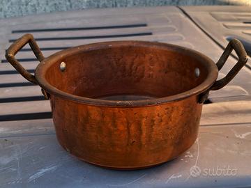 Metà del Novecento. La superficie della piccola pentola è liscia, il fondo invece è caratterizzato da una punzonatura in rilievo sul lato esterno. I manici rivettati sono in ottone, lega comunemente usata in passato per la resistenza al calore. Diametro: 13 cm.
