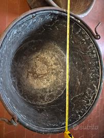 Antiche pentole in rame, con un bel colore brunito e sfumature verdi dovute all'ossidazione. Utilizzate all'inizio del 1900 per cucinare nel braciere