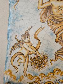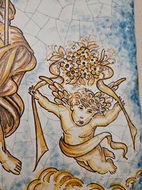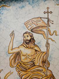 Pergamena in ceramica di Caltagirone raffigurante Cristo Risorto, realizzata e dipinta interamente a mano. Pezzo unico, decorazione in stile tradizionale siciliano con dettagli dorati e blu. Ottime condizioni. Ideale come oggetto da collezione o arredamento sacro.