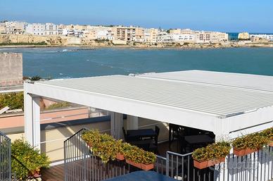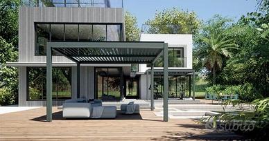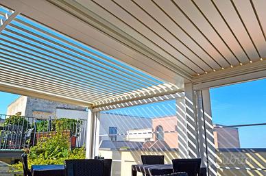 PERGOLA BIOCLIMATICA AUTOPORTANTE O ADDOSSATA MT L. 4,00 X SP 4,00 X H 2,50 SOTTOTRAVE, STRUTTURA E COPERTURA IN ALLUMINIO VERNICIATA A POLVERI CON LAMELLE FRANGISOLE ORIENTABILI AUTOMATIZZATE TRAMITE RADIOCOMANDO.