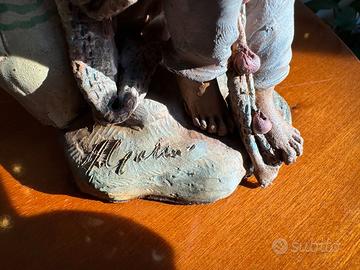 Splendida scultura artigianale in terracotta policroma interamente dipinta a mano. Raffigura un pescatore seduto con la sua rete da pesca e un’anfora, con un incredibile realismo nell'espressione del volto e nei dettagli anatomici (mani e piedi). Materiale: Terracotta/Ceramica artistica. Dettagli: Firma dell'autore Mario Galesi incisa sulla base (stile scuola di Caltagirone/Sicilia). Condizioni: Ottime, pezzo vintage da collezione ben conservato. Stile: Arte povera, decorazione rustica, pezzo per presepe artistico. Dimensioni: 10x18 cm circa - peso circa 500gr Perfetto per amanti dell'artigianato italiano o come pezzo unico per il presepe. Spedizione accurata con imballaggio super protettivo.