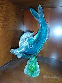 Scultura in vetro di Murano raffigurante un pesce, anni '60. Un classico esempio di arte vetraria veneziana realizzato con tecniche artigianali. Vetro soffiato e modellato a caldo, tecnica "sommerso", che crea effetti di colore stratificati all'interno del vetro trasparente, caratterizzato da forme fluide, trasparenze e bollicine d'aria decorative Oggetto decorativo da esposizione per interni, come scaffali o tavoli. Altezza 40 cm