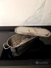 I manici in acciaio ne consentono l'uso anche per cotture al forno. Oltre allo zampone e agli arrosti, è possibile cucinare i più svariati tipi di pesce anche di grandi dimensioni in acciaio inox. Grazie alla sua griglia è possibile, una volta ultimata la cottura, estrarre il pese o il cotechino senza paura di romperlo.Adatto per gas, elettrico, vetroceramica, forno. Consentito il lavaggio in lavastoviglie.