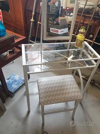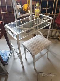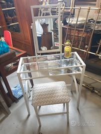 Piccola petineuse in metallo bianco e doppio vetro con specchio e sgabello imbottito. Misure: (73 × 33 h. 130)