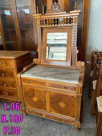 Mobile pettiniera da camera, in piuma di noce con cornice specchio intagliata e inserti legno noce torniti , marmo di Carrara. Epoca fine 1800 Prezzo valutato 1300,00 Svendo 350,00