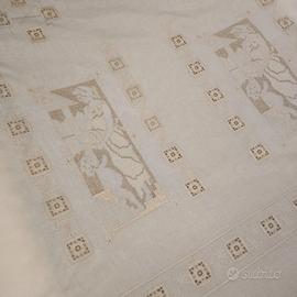 Pezza di stoffa da tenda per interni in cotone grezzo altezza 300 cm lunghezza circa 30 metri, nella parte metà inferiore ci sono ricami con figura di donna in stile antico / classico e bambino ai suoi piedi, altri ricami geometrici, la metà superiore invece è liscia. Rotolo fondo di magazzino tappezziere, prezzo originario indicato nel cartellino Lire 92,000 al metro (47€)