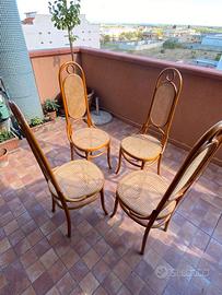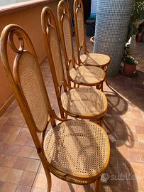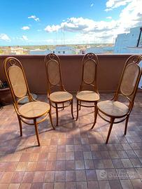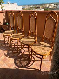 QUATTRO SEDIE IN FAGGIO NATURALE CURVATO, ORIGINALI FISCHEL (AUSTRIA), CON FONDO E SCHIENALE IN PAGLIA DI VIENNA RIFATTI A MANO, FINEMENTE RESTAURATE, DI NOTEVOLE PREGIO ED EQUIVALENTI ALLA NUMERO 17 DI THONET. EPOCA PRIMI NOVECENTO.