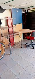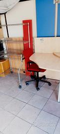 Piccola scrivania rovere, sedia con braccioli girevole, libreria acciaio 80 x 150 , 2 mensole rosso lung. 150 , tutto ottime condizioni.