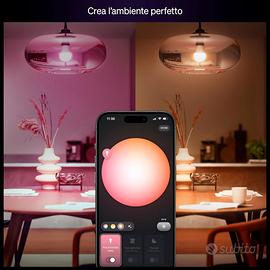 CONTENUTO DELLA CONFEZIONE - Lo starter kit include uno Hue Bridge e 4 lampadine led smart E27, basta sincronizzare il Bridge con le lampadine usando l'app per iniziare a usarle CREA L'ATMOSFERA GIUSTA - Con queste lampadine colorate led puoi scegliere tra una vasta libreria di scene di luce preimpostate, usare scene speciali per le feste, e crearne di tue FACILITÀ DI REGOLAZIONE - Regola la luminosità delle lampadine rgb dal valore massimo fino al 2% con l'app Hue per ottenere il giusto livello di illuminazione delle per leggere o rilassarti CONTROLLO VOCALE - Connettiti ad Alexa, Google Assistant o Apple Home e controlla le lampadine wifi senza sforzo da remoto con i comandi vocali