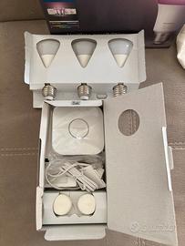 Vendo Philips Hue White and Color Ambiance Starter Kit E27, composto da Hue Bridge e 3 lampadine smart E27. Il kit permette di controllare l’illuminazione da app, usare scenari luce, regolare intensità e colore, e integrare il sistema con assistenti vocali compatibili. Le lampadine sono E27, LED, dimmerabili, con luce bianca e colorata, set ideale per chi vuole iniziare o estendere il proprio ecosistema Philips Hue. Il prodotto è pari al nuovo e completo di scatola e accessori visibili in foto. Perfetto per salotto, camera da letto o studio, consente di creare atmosfere diverse con milioni di colori e varie tonalità di bianco freddo/caldo.