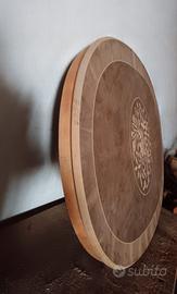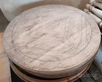 Piano di tavolo tondo grezzo in radica di noce canaletto e noce nazionale.