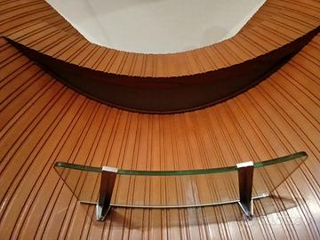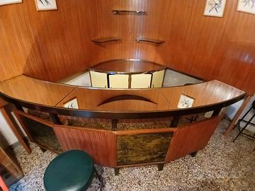 Angolo-Bar di legno con rifiniture in metallo ottone, mensole di vetro, piano a specchio, luce angolare, penisola specchiata profilata in ottone e cinque sgabelli con sedute color verde scuro; il tutto con un ricordo Art Déco per un tocco di classe al Vostro Soggiorno, al Vostro Open-Space, al Vostro Hotel o Ristorante.