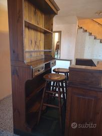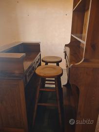 Piano Bar in legno massello, con pedana in tessuto, coppia di sgabelli molto resistenti inclusi, cassetti e mensole robusti e senza difetti.