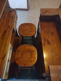 Piano Bar in legno massello, con pedana in tessuto, coppia di sgabelli molto resistenti inclusi, cassetti e mensole robusti e senza difetti. È tenuto molto bene; smontabile per consentire un trasporto più facilitato. - Prezzo e trasporto trattabili. - Ottimo per chi ha taverne o cantine, ma anche per salotti abbastanza capienti. -Motivo di vendita: cambio di arredo