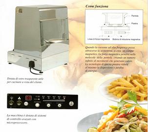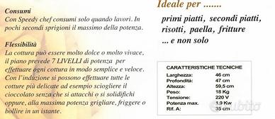 La macchina Speedy Chef con tecnologia a induzione nasce per incontrare le esigenze di quei locali che per motivi di spazio non riescono ad installare una cucina da ristorante. Grazie all'induzione di ultima generazione riesce a friggere e a cuocere qualsiasi alimento. Particolarmente idonea per la frittura di patatine, la frittura di pesce ,la frittura di olive all'ascolana ,frittura di carne come cotolette, la frittura di verdure etc. Grazie alla potenza della piastra a induzione la frittura risulta sempre croccante e mai oleosa. Il risultato è un prodotto sempre gustoso per i vostri clienti. Il tutto con un consumo elettrico risulta molto basso. Friggere non è mai stato cosi semplice e veloce. La piastra a induzione inoltre non è pericolosa, infatti non necessita di fiamme libere e si scalda solo per contatto con la pentola. La piastra a induzione Speedy Chef evita infine inutili sprechi di energia spegnendosi automaticamente una volta che la pentola viene sollevata.