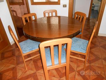 Vendo un tavolo rotondo in legno con sei sedie con prolunga che diventa ovale. (VEDI FOTO) e un piano cottura con coperchio in vetro a gas .