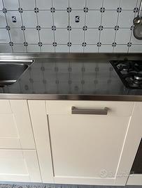 PIANO CUCINA monoblocco in acciaio inox L. cm. 263 P. cm. 60, composto da lavello a due vasche da 90 cm. completo di rubinetteria, ripiano da cm.60, piano cottura a gas da 5 fuochi con inserti in ghisa da cm. 65. Non sono compresi mobili ed elettrodomestici.
