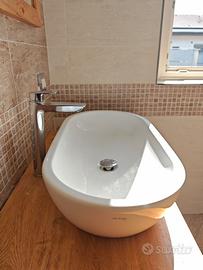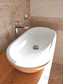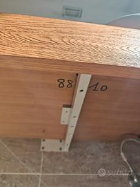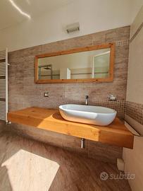 Piano di appoggio in legno trattato per bagno con lavabo ovale in ceramica, miscelatore alto Ideal Standard, con 3 staffe in ferro bianche da posizionare sotto per il fissaggio del piano come da fotografia. Specchio con cornice di legno come il piano d'appoggio. Piano cm. 160x50x12 Specchio cm. 146x56 Lavabo d'appoggio ovale 60x35