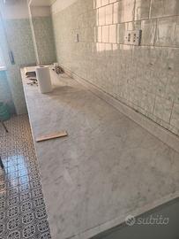 Top in marmo Carrara spessore 3cm lunghezza 120 + 180 con incasso piano cottura e 120 incasso lavello. Ottimo per ambienti vintage. Con forno e piano cottura Rex e lavello 2 vasche e gocciolatoio inox. Volendo anche basi legno laccato bianco con ante bugnate e cassettini. Ritiro immediato perché sto iniziando i lavori.