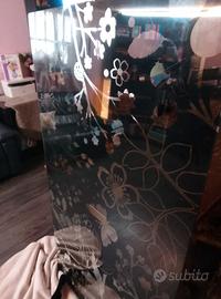 A malincuore per cambio arredamento vendo ripiano in vetro decorato con fantasie di fiori e farfalle nero. Io lo utilizzavo sopra i due mobiletti bassi che cedo a titolo gratuito. Ottimo come soluzione per il giardino o per rinnovare un tavolo ponendolo sopra. O come ho fatto io con due supporti laterali di vostro gusto. Lo usavo come scrivania elegante. Adatto per progetti fai da te. È molto solito e pesante.