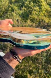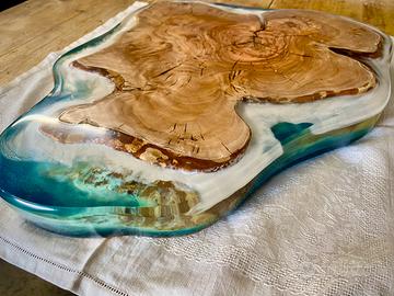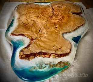Piano per tavolo da soggiorno sagomato in radice di legno massello di ulivo e resina epossidica effetto mare