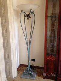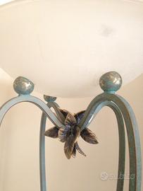 Elegante piantana e applique realizzati in ferro battuto con finitura verde e dorata anticata, caratterizzata da un raffinato effetto artigianale che le conferisce fascino e personalità. La linea sinuosa e la combinazione di materiali li rendono dei pezzi decorativi di grande bellezza, capace di adattarsi sia a interni classici che contemporanei.