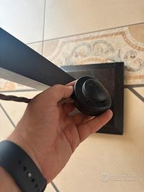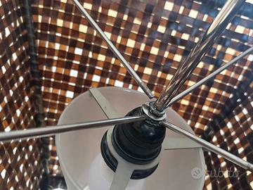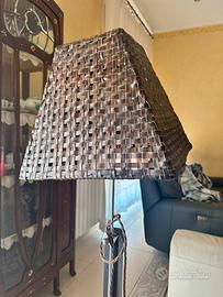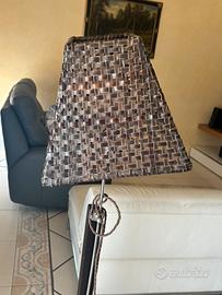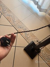 La piantana qui presente è costituita da una base in legno, un cavo rivestito di tela che si attacca alla corrente tramite presa schuko. Interruttore da terra. Bisogna sistemare tramite saldatura il copri lampada e avvitare bene quest’ultimo attraverso un dadino.