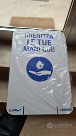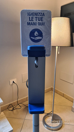 Piantana nuova di disinfezione per l'ingresso adatto per uffici, cantieri, bar, ristoranti, costituita da un supporto da pavimento con erogatore di gel igienizzante e cartello.