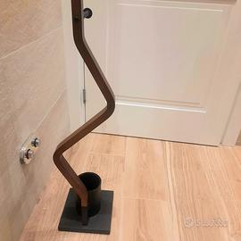 Piantana da bagno di design in legno e acciaio, nero/marrone. Porta rotolo carta igienica e scopino. H. 75 cm. Base 18.5 x 18.5 cm.