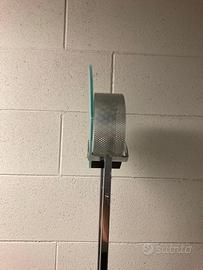 Questa piantana moderna e oggetto di design ha una base circolare in acciaio, una struttura sempre in acciaio e una parte superiore costituita da una lastra in vetro satinato a forma di ventaglio che maschera la parte in cui viene collocata la lampadina alogena ed eventualmente anche led compatibile. La base in acciaio ha un diametro di 29 cm e un'altezza di 188cm.