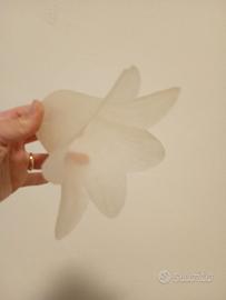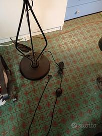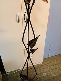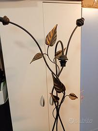 piantana marrone e oro in ferro battuto,con tre punti luce a forma di fiore in vetro soffiato,perfettamente funzionante e integra