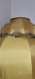 Elegante lampada da terra con struttura dorata e paralume in tessuto giallo (seta con due minori imperfezioni) con frange decorative. Design raffinato e dettagli curati, perfetta per ambienti retrò o arredamenti classici. Ottimo stato di conservazione, da montare filo elettrico