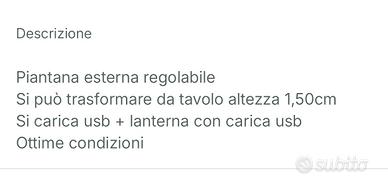 Piantana x esterno e interno regolabile in altezza Si trasformare anche da tavolo , con uscita usb + lampada da tavolo cin uscita usb Altezza 1,50cm