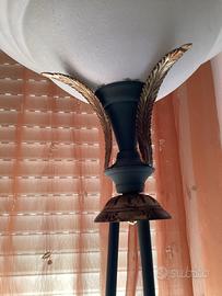 Piantana molto originale formata da base dorata. 3 pilastri colore azzurro e la parte illuminante formato da una grande coppa di vetro con foglie dorate Alla base il reostato per aumentare o ridurre l’illuminazione