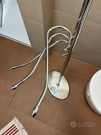 Piantana porta accappatoi e asciugamani, in perfette condizioni. Altezza 175 cm. Base 25 cm. per 35 cm. Lunghezza braccio porta asciugamani 32 cm.