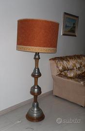 Questo oggetto è una rara piantana vintage degli anni '70, un tipico pezzo di arredamento modernariato. Design: Caratterizzata da uno stelo lavorato, in legno e metallo, che sostiene un ampio paralume in tessuto originale. Stile: Ricorda lo stile degli anni '70, spesso con finiture decorative sul metallo e paralumi dai colori caldi. Utilizzo: Lampada da terra decorativa e funzionale per interni. prezzo lievemente trattabile