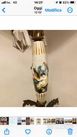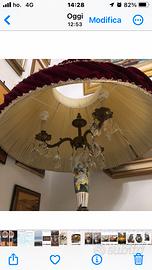 Piantana vintage anni 50/60 con decori dipinti a mano in porcellana su supporto in bronzo e gocce in cristallo, Cappello originale con bordi in velluto originale rosso come foto.