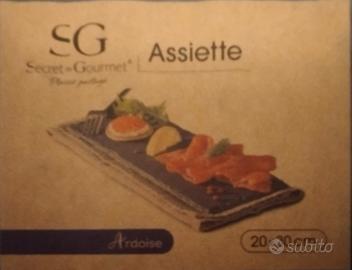 vendo elegante piastra cottura e da portata in pietra di rdesia. Perfetta per servire antipasti o piatti caldi. Dimensioni cm 30 x 20. Materiale in pietra naturale. Marca SG Secret de Gourmet. Assiette. Nuova mai usata.