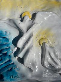 Piastra figurativa in ceramica smaltata a tema religioso in bassorilievo. Dimensioni 26 cm x 26 cm. Firma sul fronte