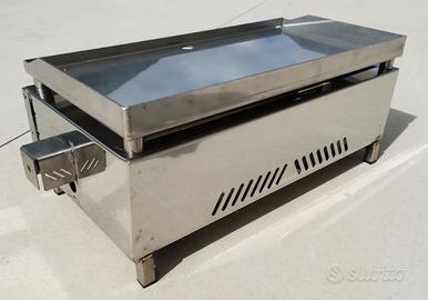 Piastra per cottura con alimentazione a GAS modello FRY-TOP completamente realizzato in Acciaio Inox, munito di bruciatore con manopolina di regolazione intensità.